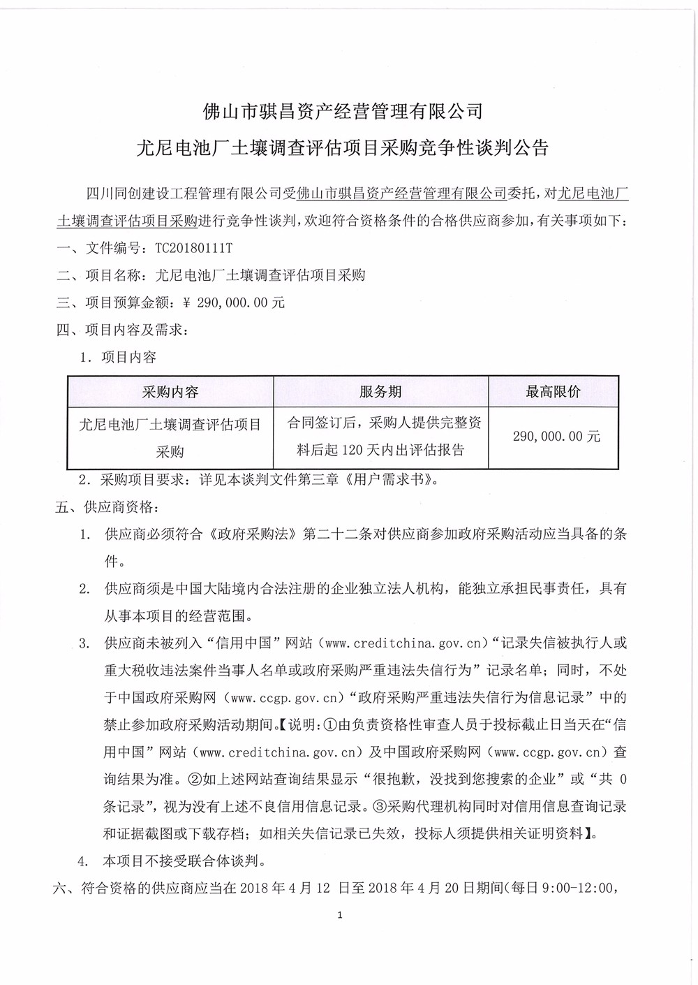佛山市騏昌資產(chǎn)管理有限公司 尤尼電池廠土壤調(diào)查評估項目采購競爭性公告